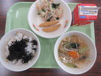 今日の献立はなめし、牛乳、ちくわの磯辺揚げ、キャベツのたくあん和え、そうめん汁、七夕ゼリーでした。