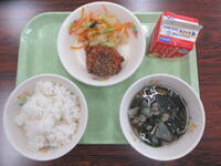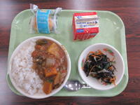 今日の献立は発芽玄米ご飯、手作りふりかけ、牛乳、味のカレー焼き、お豆のサラダ、厚揚げの味噌汁でした。