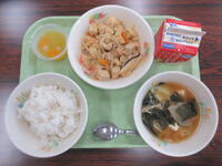 今日の献立は、ご飯、牛乳、高野豆腐の卵とじ、豆腐とわかめの味噌汁、手作りオレンジゼリーでした。