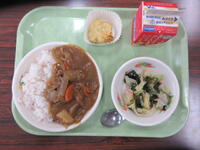 今日の献立は、麦ご飯、牛乳、ポークカレー、海藻サラダ、スイートポテトでした。