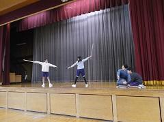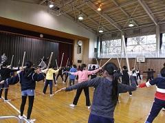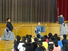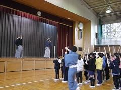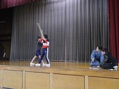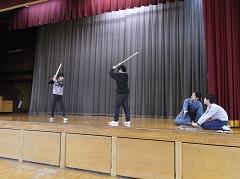 新聞紙で作った刀で振りと立ち回り等の練習をし、発表しました。