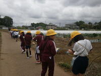 この事業として、5年生が清水高校に出かけて行き、清水高校食品科学科の生徒の皆さんと一緒にピーマンの苗植えを行いました。苗植えの後は、清水高校の広い校庭で一緒に遊んでもらい、子供たちは大喜びでした。