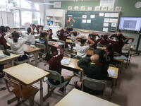 放送の訓練の合図に合わせて、子どもたちは素早く一時避難を行っていました。