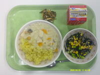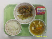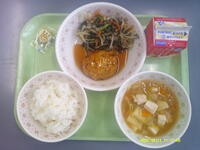 今日から、給食がはじまります。久しぶりの給食は「肉みそ丼」です。