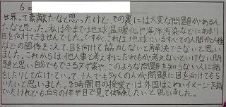 さてこの大震災がどんなものだったのか、テレビ等で見て知っている児童もいるかもしれませんが、知らない児童も多いかと思い、中央通路に大震災時の写真を何枚か張り出しました。また、お昼の放送では、校長から、少しだけ話をさせてもらいました。個人的な話になりますが、私の故郷は福島県新地町(相馬市の隣)です。海に比較的近い私の実家は、流されこそしませんでしたが、すぐ近くまで津波が押し寄せ、両親は高台に避難して、町が津波にのみ込まれるのを震えながら見ていたそうです。震災後に新地町を訪れると、そこには信じられないような光景が広がっていました。最寄り駅は駅舎ごと流され、小さかったですが港町だったところは跡形もなく消え去り、実家の近くからは見えなかった海が丸見えになり、ただただ唖然とするばかりでした。見渡す限りのがれきの山に、絶望感しかありませんでした。