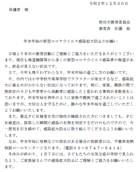 今、市内では小中学校や高等学校でクラスターが発生するなど、感染拡大に歯止めがかからない状況になっております。特に、家族、親族の間で無症状の子どもや若者から高齢者に感染したと思われる事例が多数発生しております。年末年始を例年のように家族や親族で過ごされたいこととは思いますが、大切な人を守るために、静かな年末年始を過ごしていただくようお願いいたします。