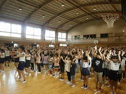 始業式の後は、サッカー部・ミニバスケットボール部そして音楽部の励ます会(壮行会)を行いました。サッカー部は普段の練習を少しだけその場で紹介し、部長が代表挨拶をしました。ミニバス部は、全選手が自己紹介をし、同じく部長が代表挨拶をしました。両部とも、20日(土)に行われる大会に出場します。音楽部は、各楽器の紹介を簡単にした後、18日(木)の市内小中学校音楽会で演奏する新曲「ダンシングヒーロー」を披露してくれました。1・2年生は、運動会で踊った曲ですので、手拍子をしながら、楽しそうに聴いていました。演奏後は、やはり部長が代表挨拶をしました。励ます会の最後は、応援団が中心となり、全校児童で部員へエールを送りました。