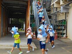 震度5強の地震が発生したという想定で実施しましたが、どの学年も無言で素早い避難ができました。1年生も、全校で行う避難訓練は初めてでしたが、先生の指示をしっかり聞いて、上手に避難できました。