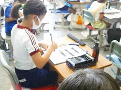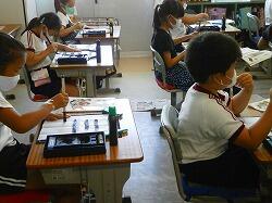 3年生は、初めて毛筆の練習をしました。硯の使い方や基本の筆の持ち方を学習し、まずは「一」を書くことから始めました。恐る恐る筆を運ぶ様子がみられましたが、「初めてにしてはみんな上手だよ!」と先生にほめてもらって、嬉しそうにする子もいました。