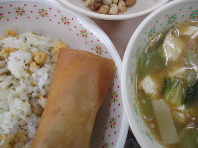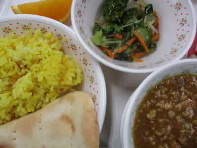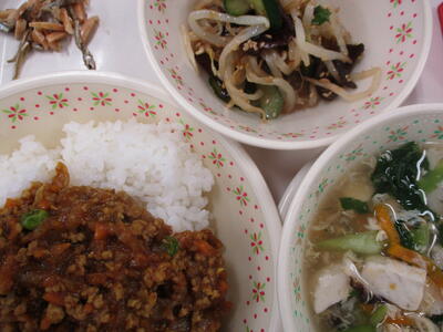 ※「カレーそぼろご飯」「もやしとキクラゲのサラダ」「豆腐のとろみスープ」「いりこナッツ」