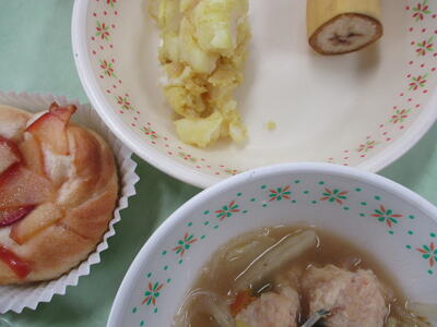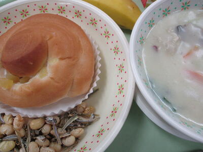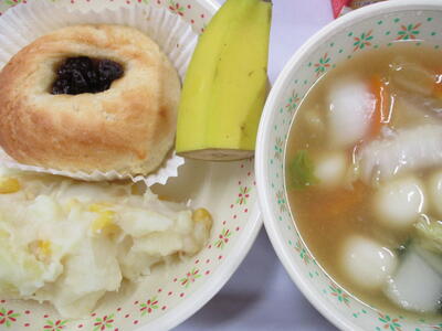 *「岩木っこパン」「だんごま雑煮」「ポテトとコーンのミルク煮」「バナナ」
