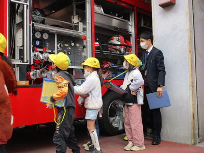 救急車はちょうど出動してしまいましたが、消防車について詳しく説明してもらいました。