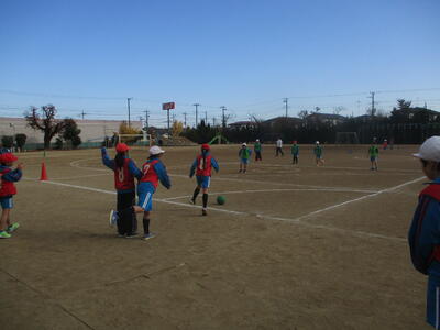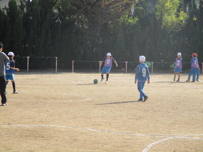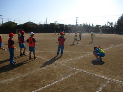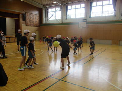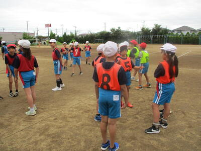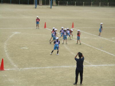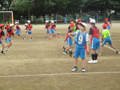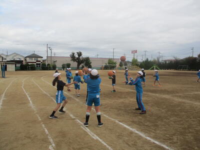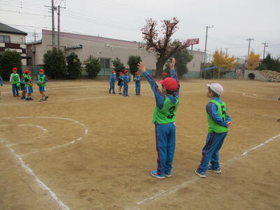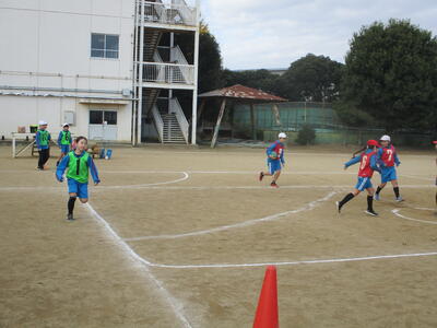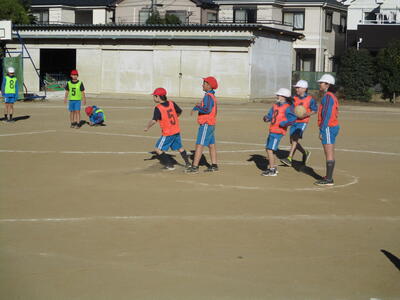 4年生 体育 「タグラグビー」 パスの練習中! がんばれ~!