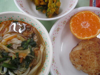 *「キムチうどん」「味噌焼きおにぎり」「かぼちゃのアーモンドサラダ」「はなみかん」