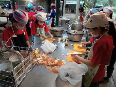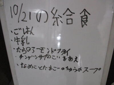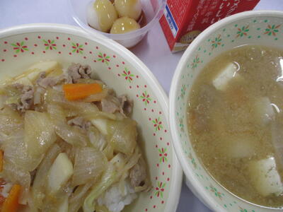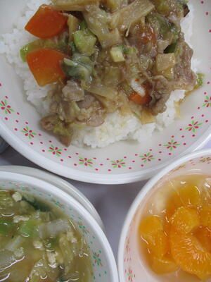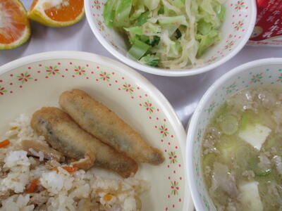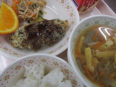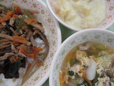 ※「キンピラ丼」「サツマイモのクリーム煮」「野菜と卵のスープ」