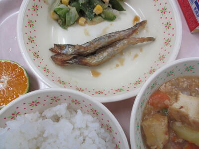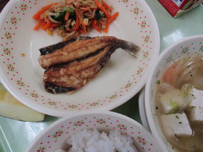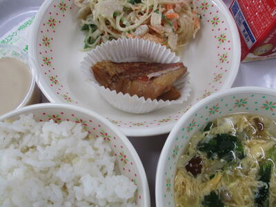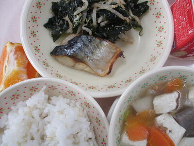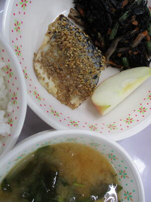 ※「サバのピリ辛焼き」「ひじきの炒り煮」「ジャガイモとタマネギの味噌汁」「りんご」