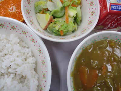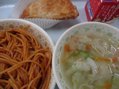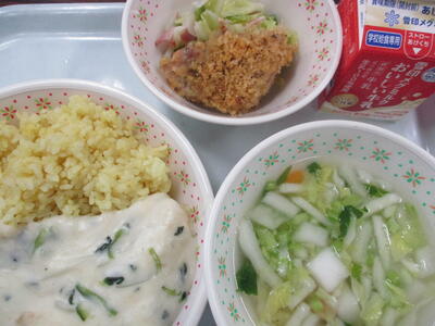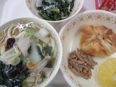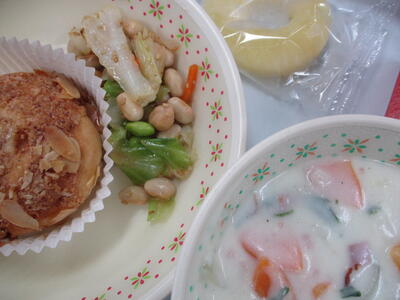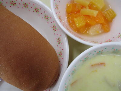 ※「岩木っ子パン」「まめまめサラダ」「青梗菜のクリームスープ」「冷凍パイン」