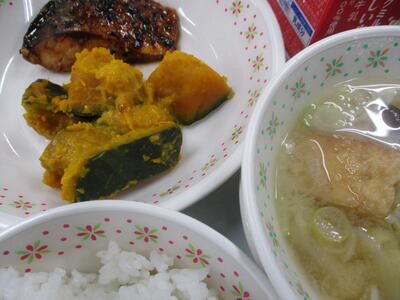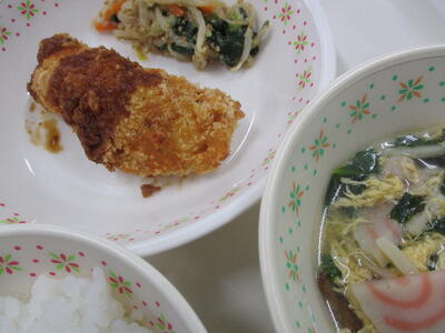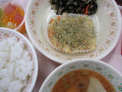 ※「焼きじゃがコロッケ」「ひじきの中華あえ」「カブと厚揚げの味噌汁」「フルーツカクテル」