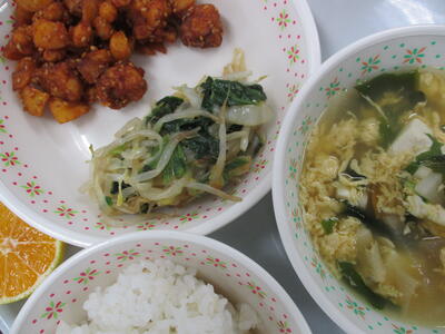 ※「鱈とポテトのヤンニョムソースがらめ」「ねぎだれのナムル」「卵わかめスープ」「はなみかん」