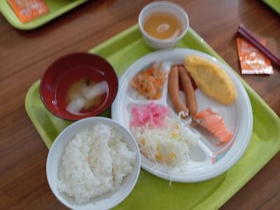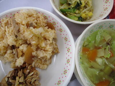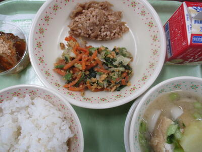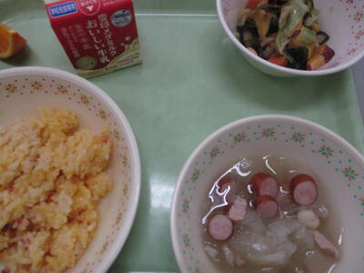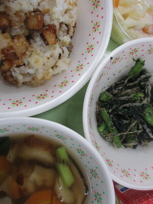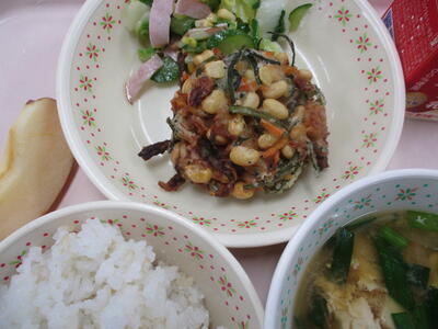 *「カツオくんわかめちゃんご飯」「ひじきのチーズサラダ」「豆乳の野菜汁」「アーモンドカル」