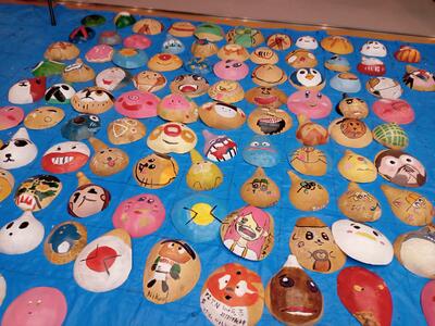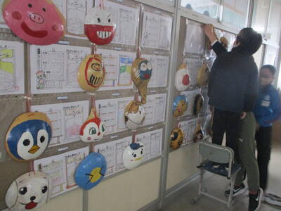 図工室前 廊下 4年生「ドロドロカッチン」作品展示 シュール!