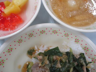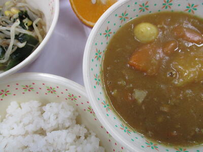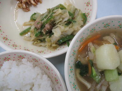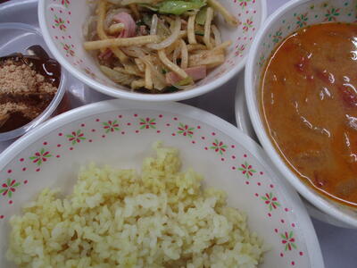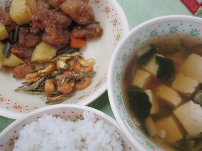 ※「鶏肉とジャガイモの照り合え」「茄子入り豆腐汁」「カレーナッツ小魚」