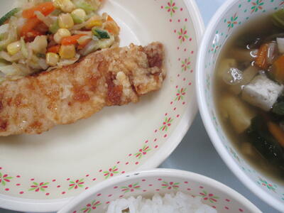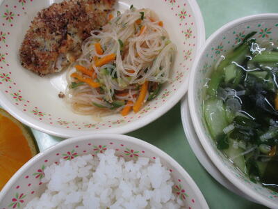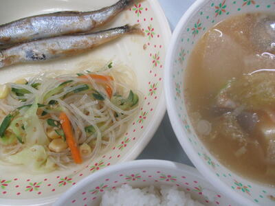 ※「シシャモの七味焼き」「野菜のごまドレッシング和え」「ニラ玉味噌汁」「わかめご飯」「フルーツミックス」