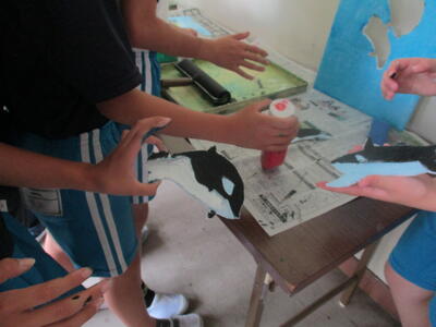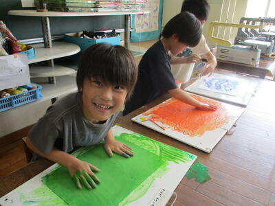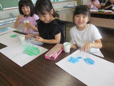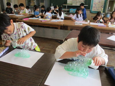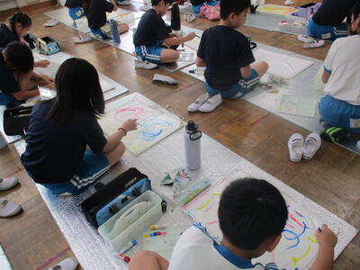 4年生 図工 画紙をカラフルに染めています。仕上がりが楽しみだね。