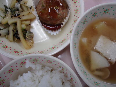 ※「照り焼きハンバーグ」「小松菜とコーンのソテー」「卵スープ」