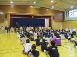 もものき学級が、合同体育の時間に練習してきた「南中ソーラン」を体育館で披露しました。自信をもって踊る姿は、力強く、たくましかったです。前列で踊る3.4年生の姿はかっこよく、1.2年生は笑顔で楽しく踊っていました。ステージで踊る5.6年生は、体を大きくつかってのびのびと踊りました。観客の先生方から、大きな拍手とともにアンコールの声がありました。アンコールに応えて、2回おどり終えた子どもたちの笑顔は、とっても素敵でした。