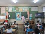 1年3組の英語活動の授業。職員研修の一環として、何人かの先生方が参観しました。