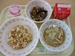 今日は、キムタクご飯・牛乳・五目煮込み・えのきとじゃがいもの味噌汁・さくらゼリー・