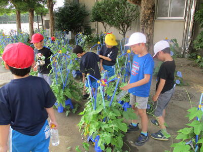 1年生 アサガオの水やり お花の数、たくさんだねぇ。