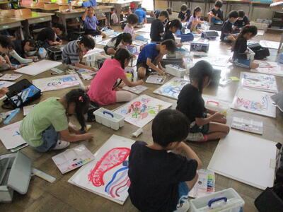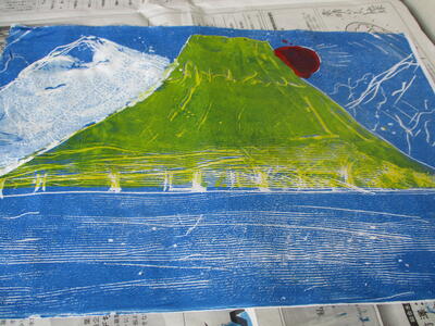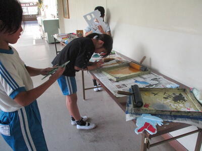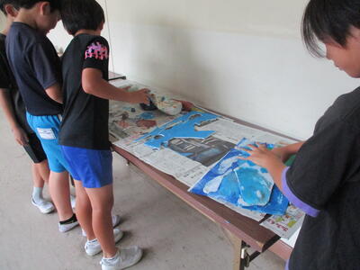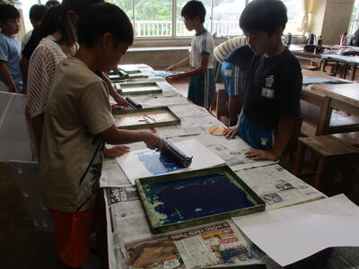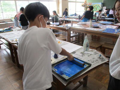 4年生 図工 「版画」 目に涼しい青色だなぁ!