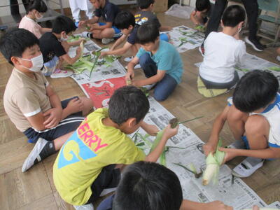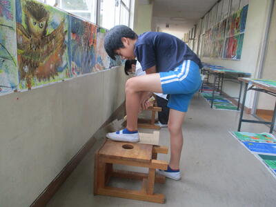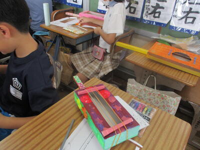 4年生 廊下 お! 手作り楽器だね。 さぁ、この後、音が出ますか?