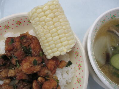 ※「鳥ニラ丼」「夏野菜汁」「とうもろこし」