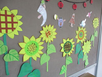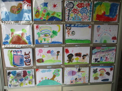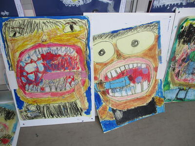 2年生 廊下掲示 さぁ、何を描いたのでしょうか?