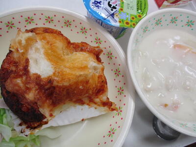 ※「岩木っ子パン」「インゲン豆のシチュー」「キャベツのソテー」「ヨーグルト」