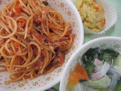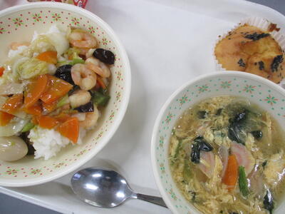 ※「五目うま煮丼」「かき玉汁」「岩木っ子マドレーヌ」