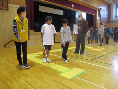 目隠しをして、白杖を手にして歩行体験です。