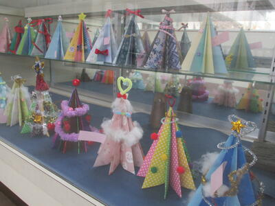 2階渡り廊下に、クラブの作品を展示しました。 クリスマスツリー!