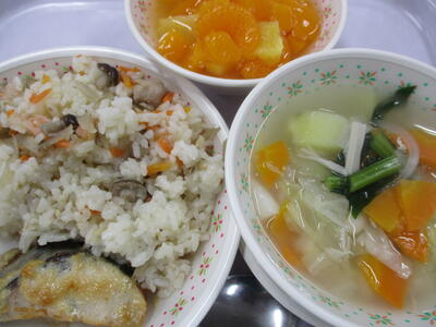 ※「鳥ゴボウピラフ」「アジの味噌マヨ焼き」「ニンジンとアサリのスープ」「フルーツミックス」