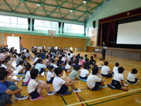 6月が始まりました。全校朝会で体育館に集まりました。
