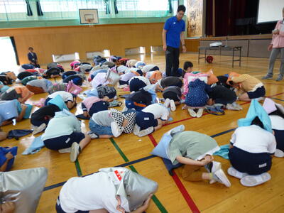 ワンポイント避難訓練では地震が起きた時の姿勢を練習しました。