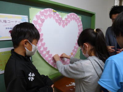 いいところを見つけた子がハートに書いています。