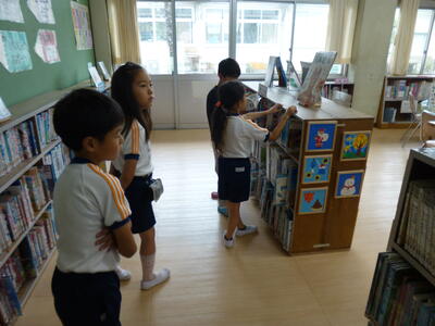 図書室で本を借りる1年生。何を借りようかな。