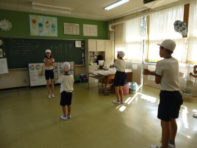 なかよし学級では朝の体操をしました。今日も外は暑いので教室で行いました。