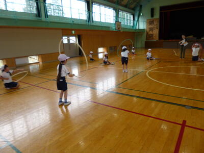 1年生 体育の学習でフラフープを使っての運動をしています。