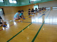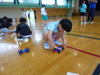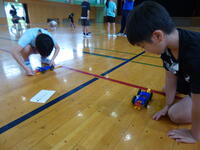 3年生 ゴムの力で動く車を作り、体育館で動かしました。