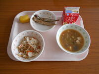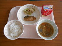 ご飯 牛乳 鯵のカレー焼き 野菜のゴマ和え さつま汁 花みかん
